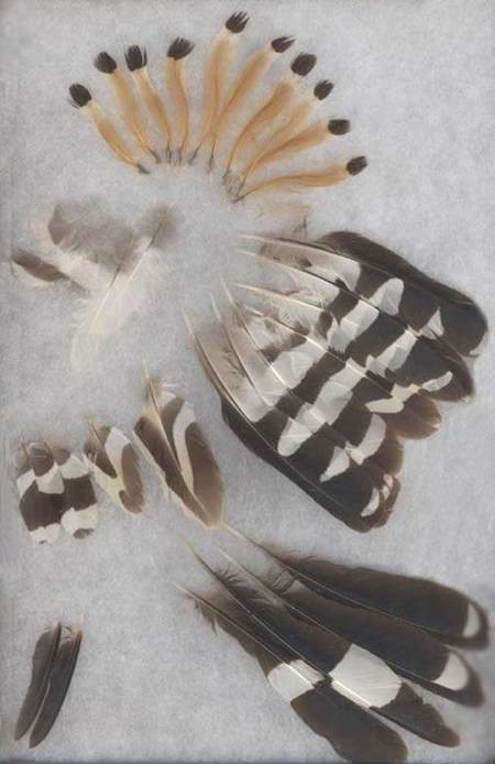 The Hoopoe is a migratory bird that spends its summers in Kythera and its winters in Africa. This bird can look a little silly, running along the road in search of insects to eat, shouting “poo, poo, poo.” But when it raises its feathered crest, the hoopoe is suddenly gorgeous. This wonderful bird has the very cool Latin name Upupa epops. Longest feather shown, 13 cm long. Gift of Stratos Kypriotis.
