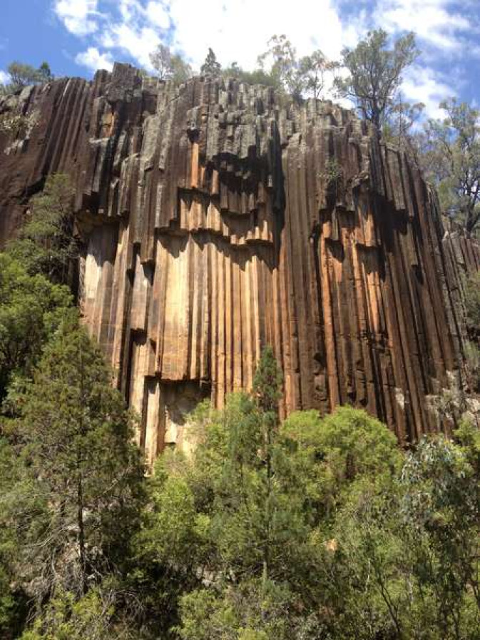 This spectacular and majestic geological feature is located 64kms out of Bingara and 36kms from Narrabri. National Parks Sawn Rocks Leaflet. The forty (40) metre high towering wall of pentagonal basalt pipes is the sheered off remains of a basalt lava flow from the Nandewar Volcano which dominated the area 21 million years ago. It is an unusual phenomenon which is the result of the slow and even cooling of molten rock which enabled individual crystals within the rock to align perfectly with each other. Visited during the