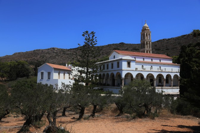 back view of myrtithia, with the olive groves in the foreground ...