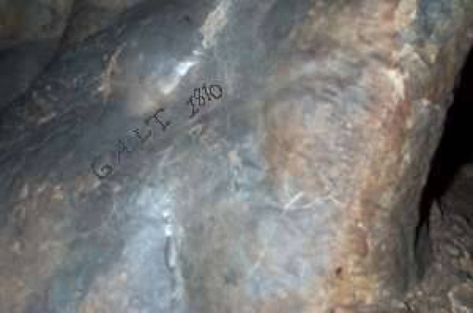 1810 graffito of English traveller William Galt in the Agia Sofia cave at Milopotamos (incised marks enhanced for clarity).