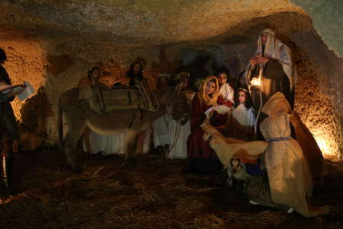 after the Christmas church service at mitata , the children of the village in a cave next to the church created the nativity scene